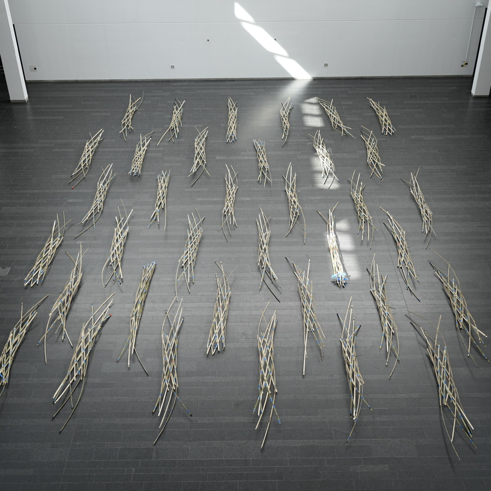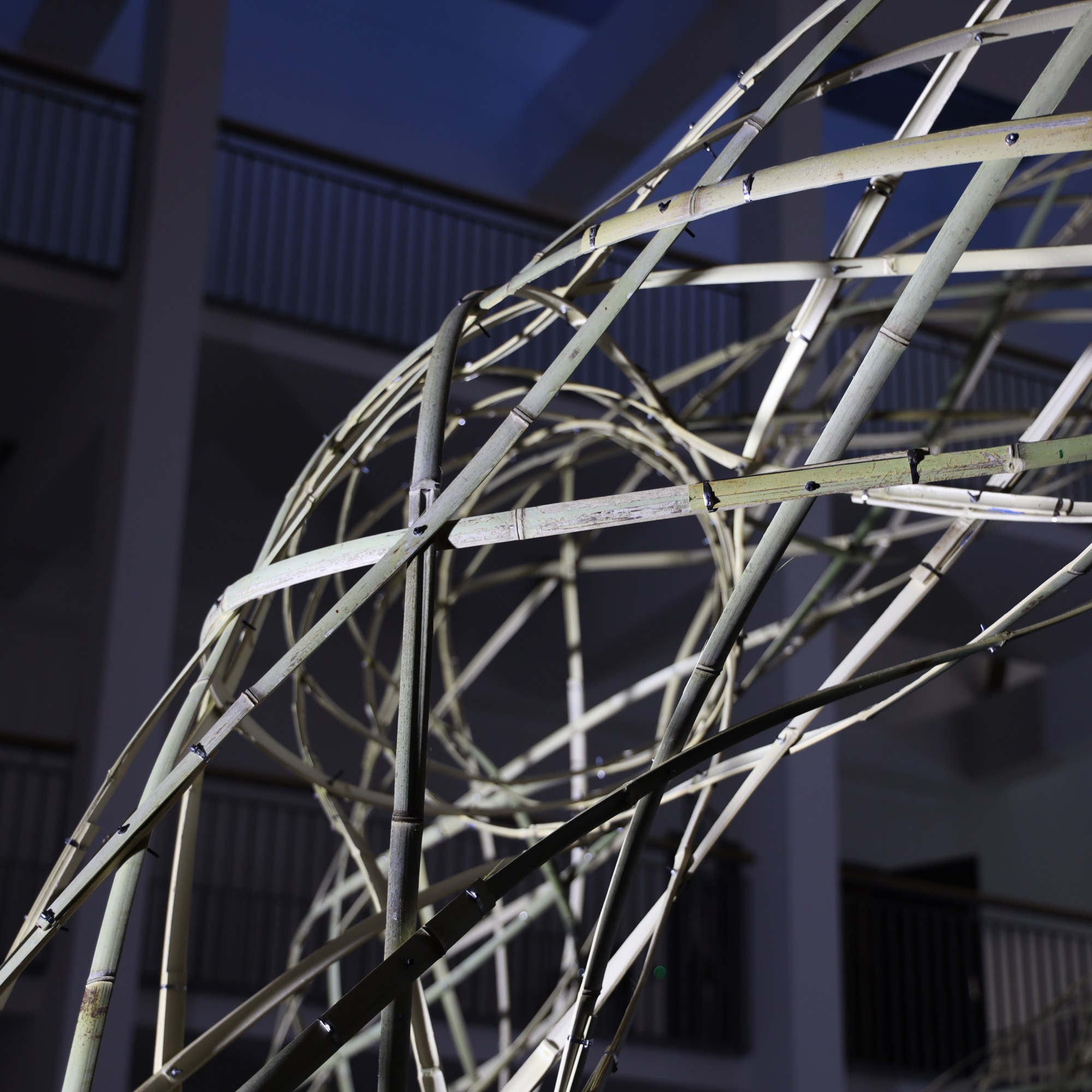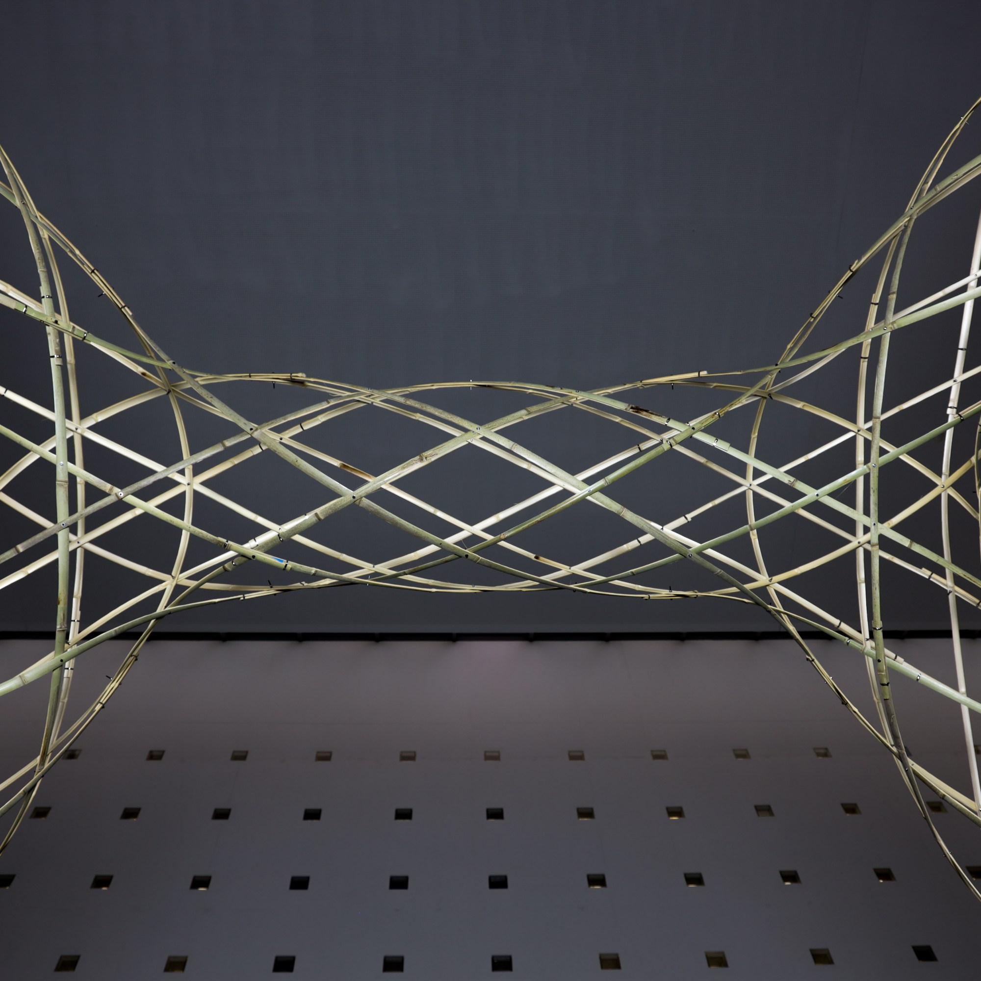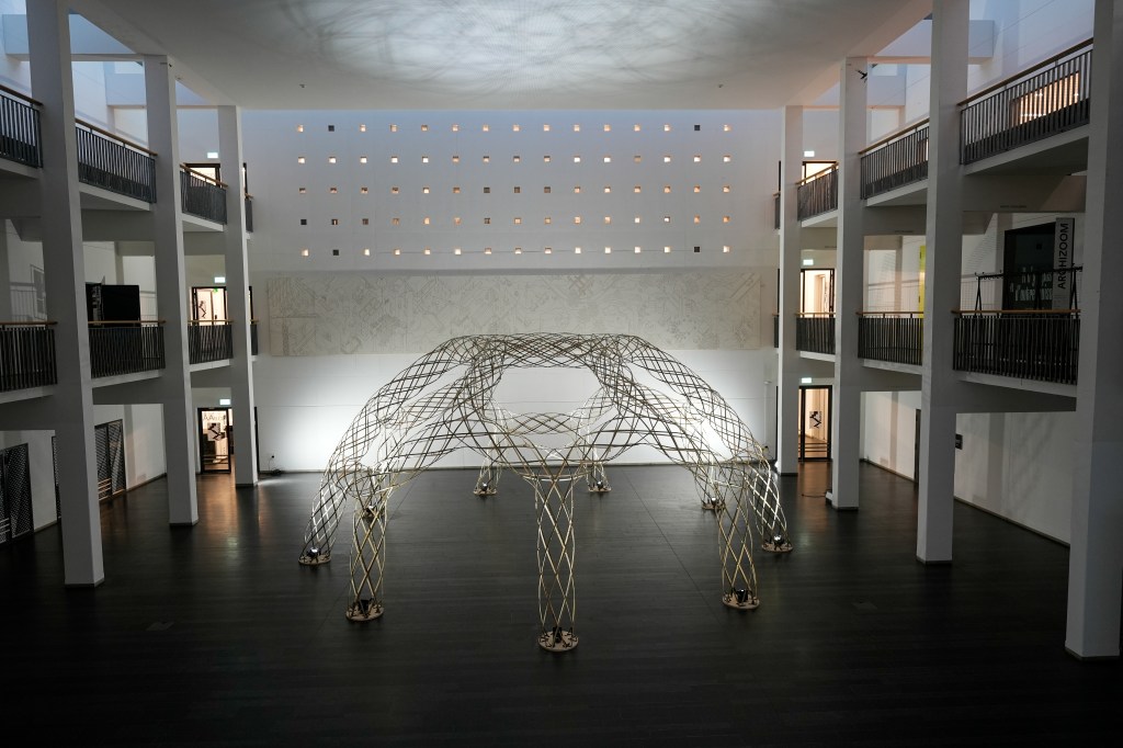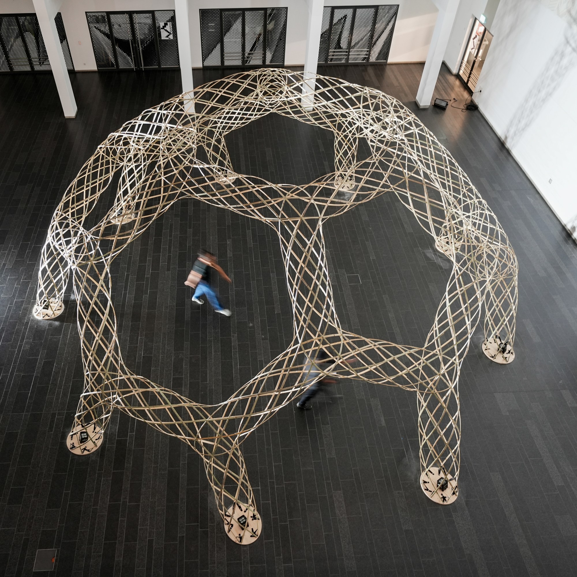 The BamX EPFL prototype spans 10.3 m and is composed of 36 deployable cylinders joined at 21 woven nodes in a mix of pentagons and hexagons. Weighing under 160 kg, the structure demonstrates a compact-to-volumetric assembly that ensures both flexibility and structural continuity.