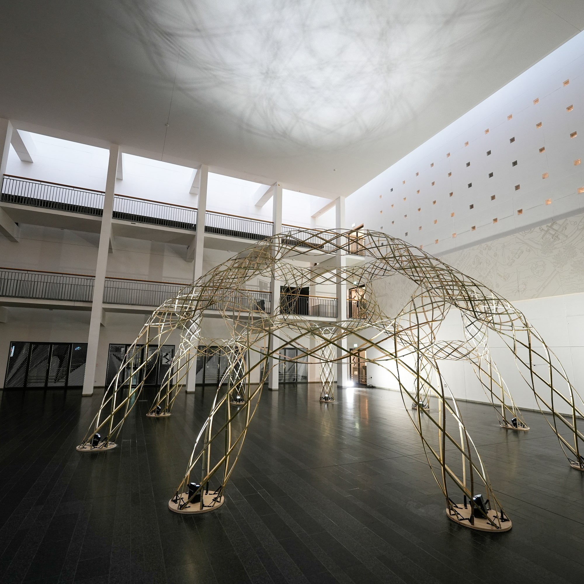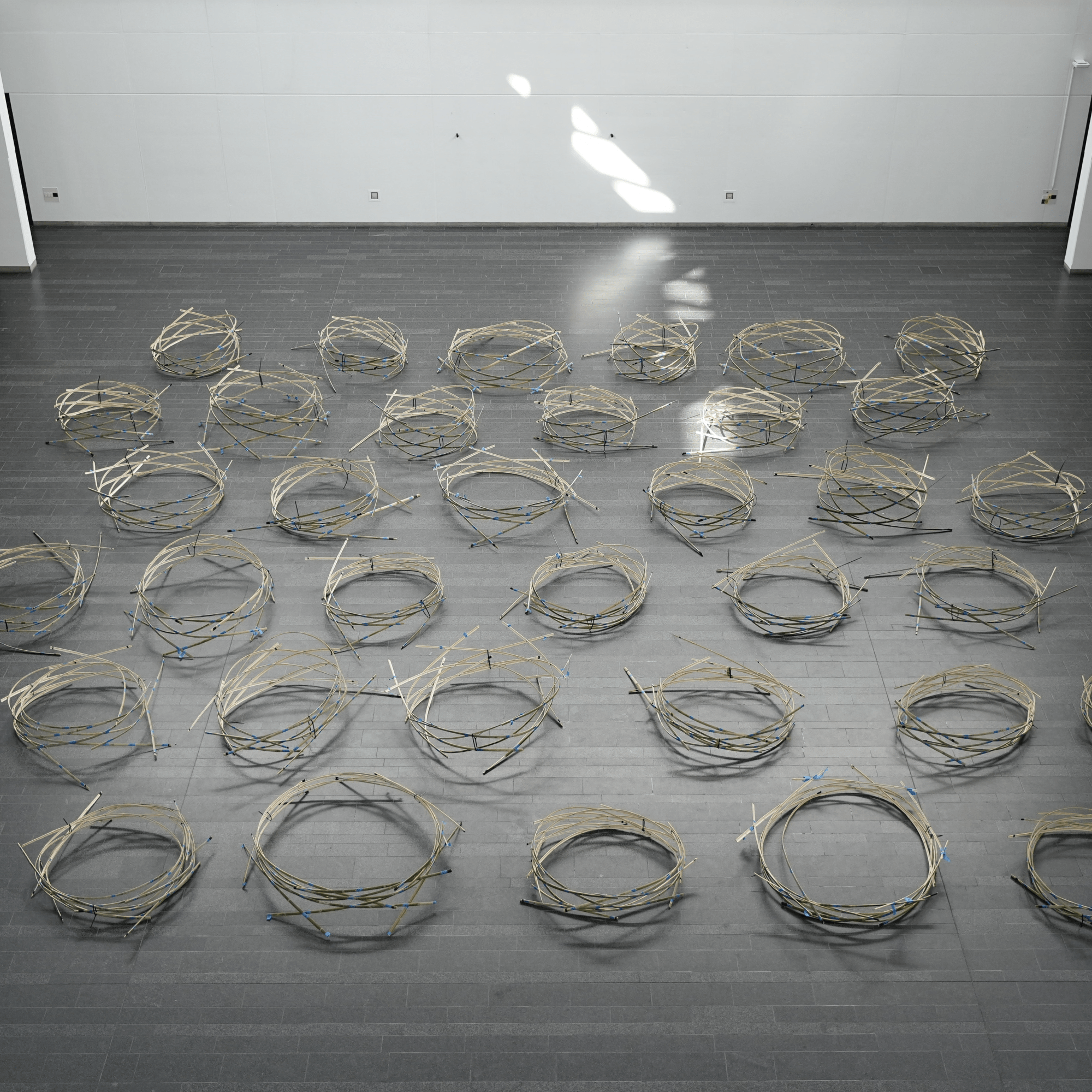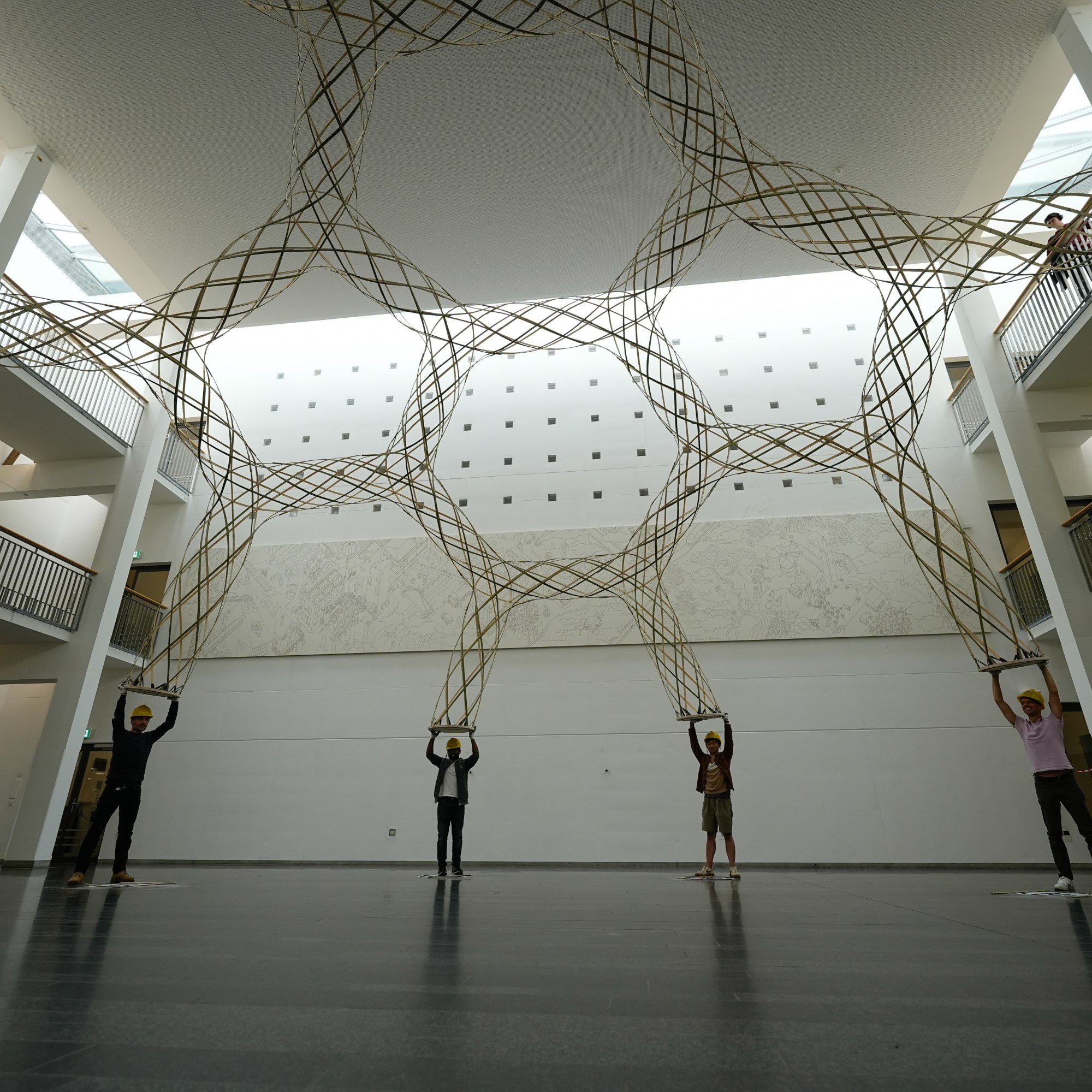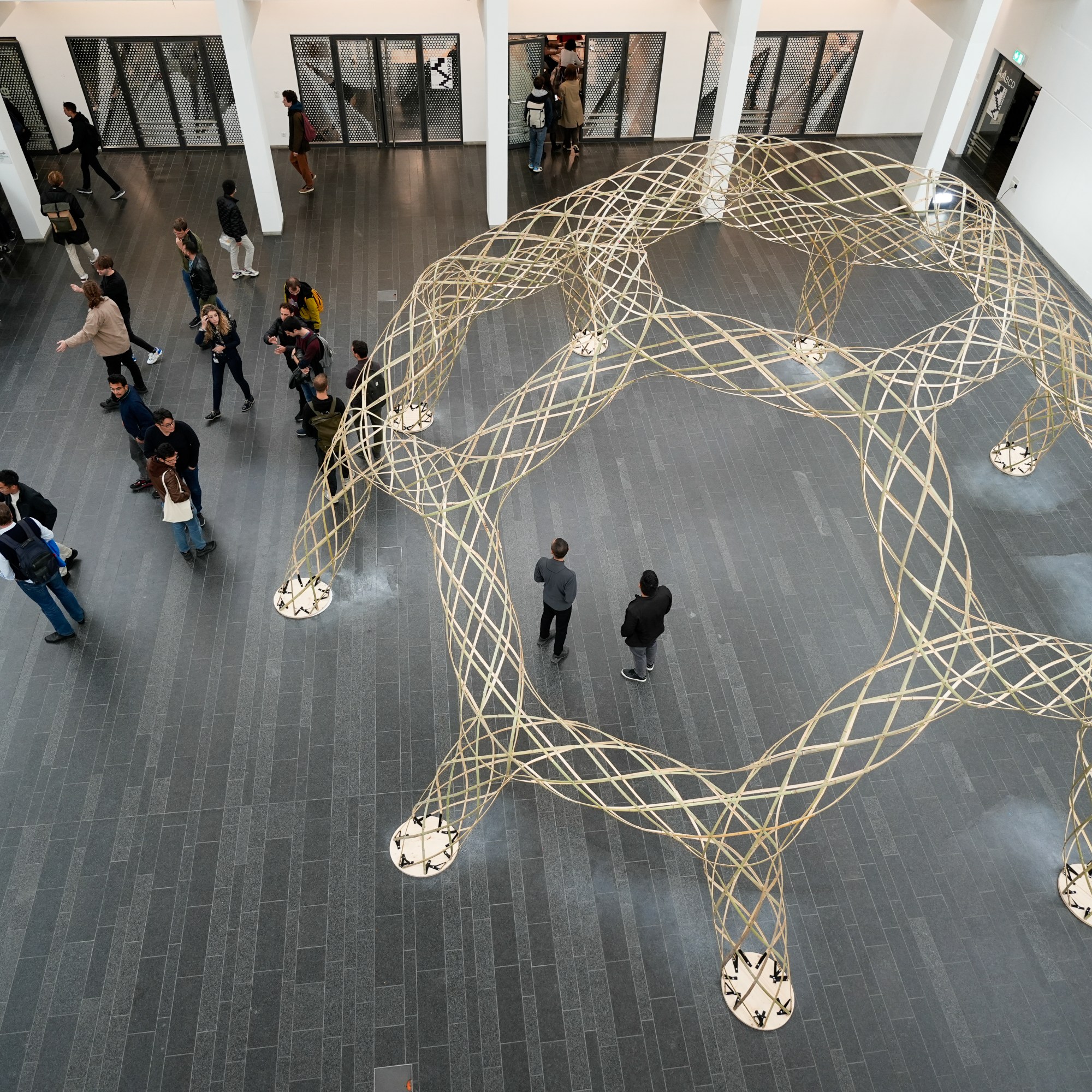 The BamX EPFL prototype spans 10.3 m and is composed of 36 deployable cylinders joined at 21 woven nodes in a mix of pentagons and hexagons. Weighing under 160 kg, the structure demonstrates a compact-to-volumetric assembly that ensures both flexibility and structural continuity.