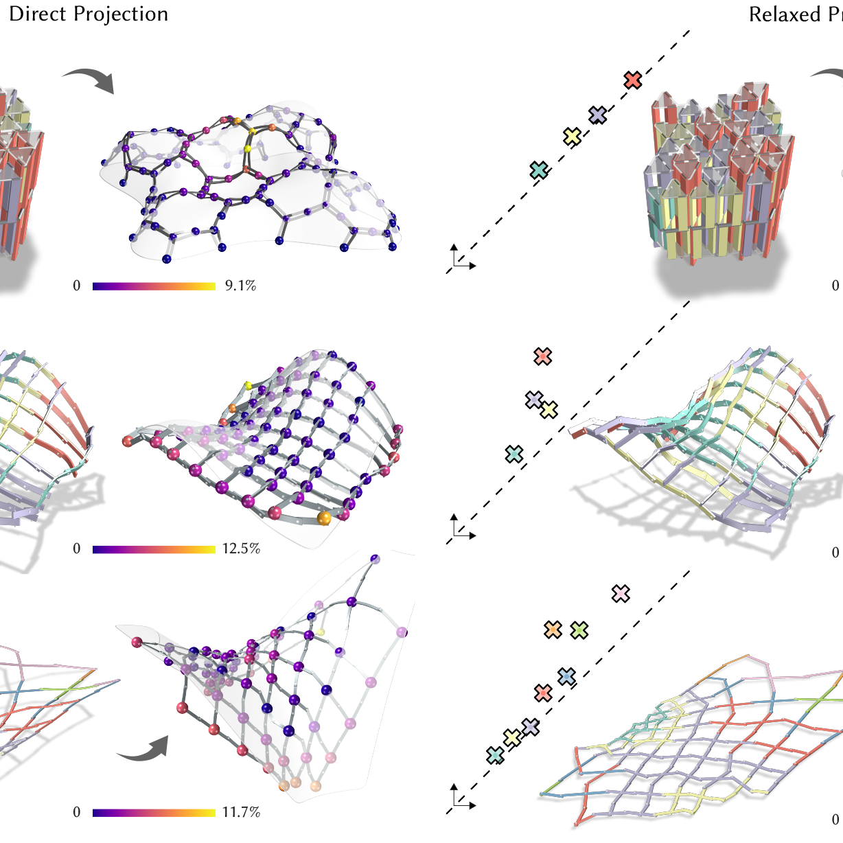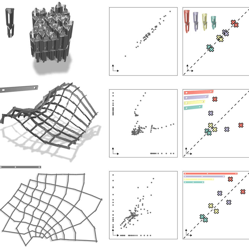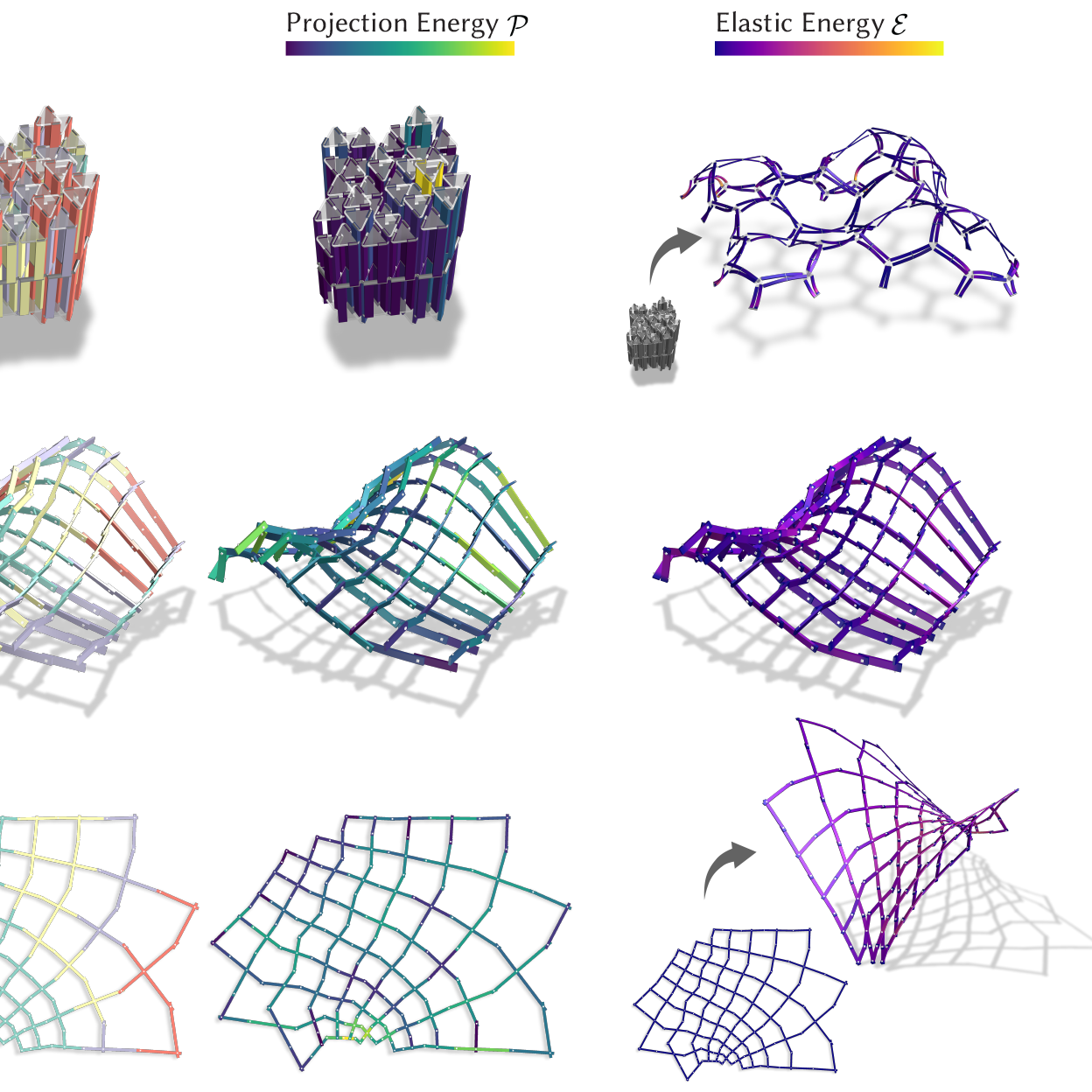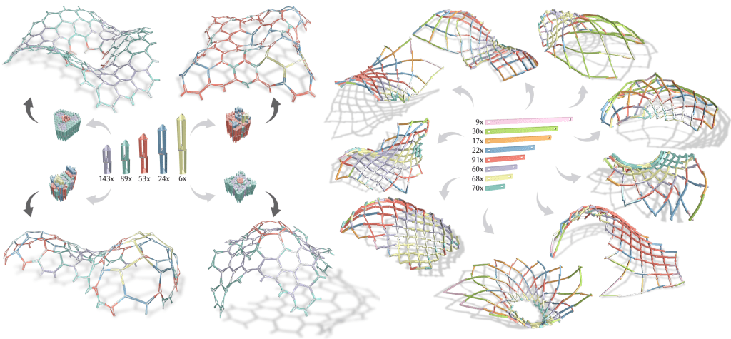 Bending-active structures are formed from elastic elements that deform into a desired shape. While inverse design algorithms have been developed to optimize each element’s geometry for a specific form, this approach often prevents the reuse of components and limits opportunities for efficient, scalable fabrication.